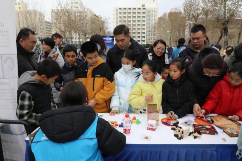 当日上午,世纪馆北广场人声鼎沸、暖意融融,数学游园会在此精彩启幕。活动以“π的奇幻之旅”为整体叙事框架,精心设计了五大主题关卡,沿着人类数学发展的认知路径铺展,从度量与计数,到符号与抽象,再到无穷、结构与随机,34个生动的数学故事串联其中,让参与者仿佛置身一场“数学文明的探险”。