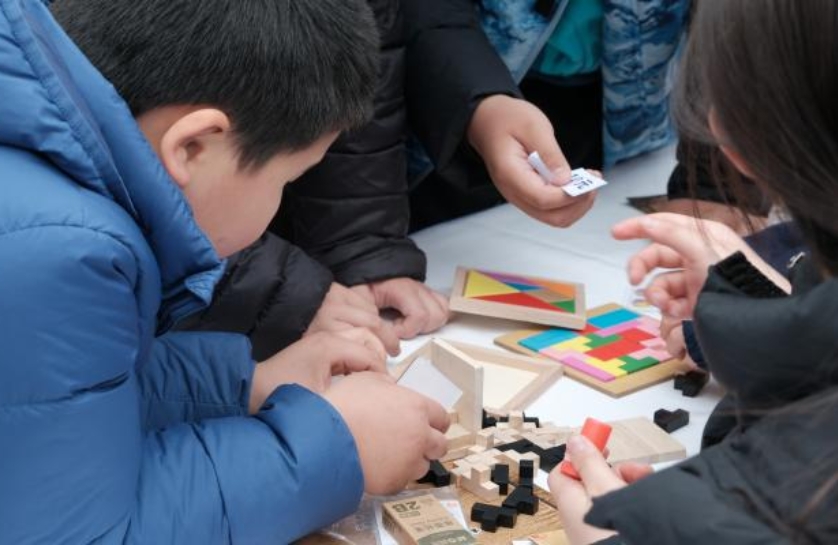 在“度量之岛”,“24点挑战”比拼心算与反应速度,“数字黑洞”寻找隐藏的数列规律,“火柴魔法阵”拼出看似不可能的结构。走进“符号之城”,参与者穿越“数独迷宫”,破解“数字密码锁”,在“函数迷踪”中寻找隐藏的数学怪兽,系列游戏成为跨越年龄的思维竞技场,孩子们一同解锁数字奥秘。“无穷之海”里,同学们进行“算力王者”挑战计算极限,“极小曲面实验室”中,铁丝框架浸入肥皂水后形成的彩虹曲面,让孩子们爆发出阵阵惊叹:“哇——原来数学可以这么美!”直观的视觉冲击,让大家真切感受到数学的浪漫与神奇。在“结构之塔”区域,七巧板拼图、莫比乌斯环体验和“不可能图形”构建,让参与者触摸空间结构的奇妙,感受数学不再只是符号,而是可触可感、可拼可造的鲜活世界。在“随机之境”区域,“蒲丰投针实验”让大家亲手验证几何概率,“博弈论挑战”上演策略对决。在这里,大家意识到,即使面对随机与不确定,数学也能帮助我们理解世界的规律。
